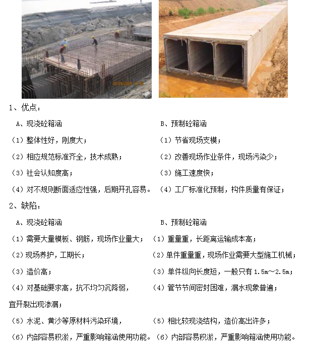 由鋼筋混凝土或圬工材料制成箱形管節(jié)的涵洞,可用來(lái)輸水、排水、蓄水、行洪,過(guò)人及車(chē)輛通過(guò)。箱涵施工一般采用現(xiàn)澆,也有部分采用預(yù)制砼。其優(yōu)缺點(diǎn)如下: