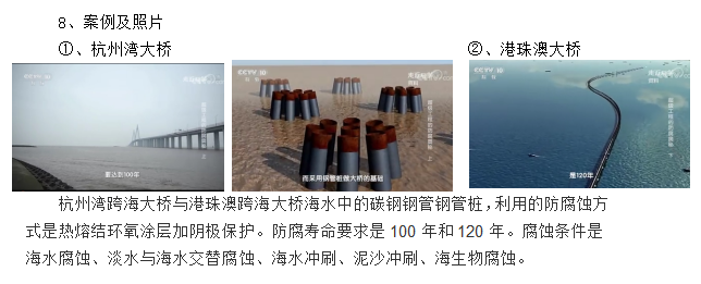 4、壽命長(zhǎng):港珠澳大橋及杭州灣大橋海水中的鋼管樁使用該防腐技術(shù),防腐年限分別是100年和120年。耐海水腐蝕,海水及泥砂沖刷,耐海水與淡水交替腐蝕,耐海洋生物腐蝕,耐打入泥沙時(shí)的樁擊。