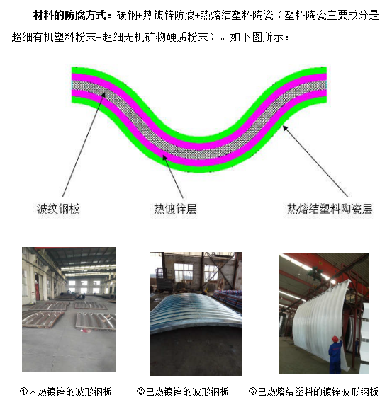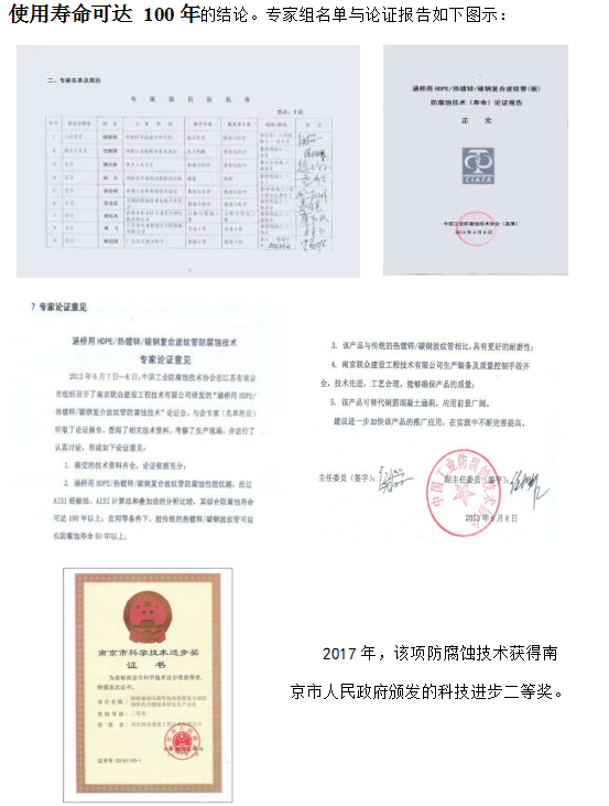 2010年,針對各地公路用熱鍍鋅波紋鋼管涵洞的腐蝕條件和行業(yè)防腐要求, 我公司與中國防腐蝕協(xié)會及南京工業(yè)大學(xué)、南京工程學(xué)院、中國石化集團(tuán)金陵石化公司等單位合作研究,借鑒及創(chuàng)新了其它領(lǐng)域的高壽命的成熟防腐技術(shù),將有機(jī)材料與無機(jī)超硬質(zhì)礦物材料融合,成功的取得了埋地用鋼結(jié)構(gòu)的熱浸鍍鋅加熱熔結(jié)塑料陶瓷的綜合防腐技術(shù),并已在國內(nèi)高速公路埋地式鋼質(zhì)波紋管涵洞結(jié)構(gòu)中運(yùn)用,效果顯著,獲得行業(yè)好評。2017 年,該項(xiàng)技術(shù)獲得南京市人民政府頒發(fā)的科技進(jìn)步二等獎(jiǎng)。